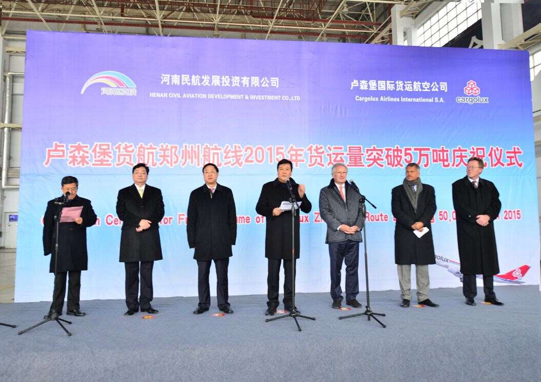In January 2014, the agreement of HNCA acquiring 35% stake in Cargolux signed; In June, "Zhengzhou-Luxembourg" international freight route opened, Cargolux officially settled Zhengzhou airport with two flights per week. The "Air Silk Road" between China and Europe is opened, the "double hub" strategy of Zhengzhou and Luxembourg showed strong potential for development, and just five months later, the fright exceeded10,000 tons in last November, Cargolux become important new force of Zhengzhou Airport. One year later, from 2 flights per week to 2 flights every day, the fright already exceeded 50,000 tons in this November. The annual freight volume of Cargolux in 2015 is expected to reach 60,000 tons on the basis of its "four first" hard power.