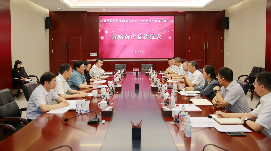 7月18日下午,中豫航空集團與河南農(nóng)投集團在農(nóng)投國際中心舉行工作會商,簽訂戰(zhàn)略合作協(xié)議。中豫航空集團黨委書記、董事長張明超;河南農(nóng)投集團黨委書記、董事長李曉寰,總經(jīng)理、副董事長張淑杰參加會談并見證雙方簽約。中豫航空集團副總經(jīng)理劉霞,河南農(nóng)投集團副總經(jīng)理張峰代表雙方簽署戰(zhàn)略合作協(xié)議。雙方相關業(yè)務負責人參加。
