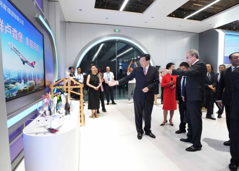 論壇開始前,與會嘉賓參觀了主題展臺。在中豫航空集團展臺前,嘉賓們被來自盧森堡的“申根精神”葡萄酒、法國知名品牌水晶杯、德國繪有“絲綢之路”元素的骨瓷等產(chǎn)品吸引;詳細了解了鄭盧“空中絲路”在中歐互聯(lián)互通、經(jīng)貿(mào)往來中發(fā)揮的橋梁作用。