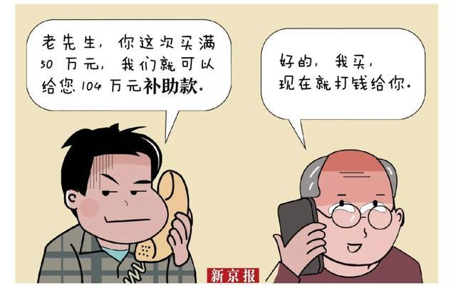 案例:70歲的劉某接到一個“保健專家”的電話,經(jīng)忽悠,劉某買了一萬多元的保健品。然而,對方又稱只要購滿50萬元,即可獲得補助款104萬元。當(dāng)劉某真的購買了遠超50萬元的保健品后,那個從未謀面的專家再也聯(lián)系不上了。