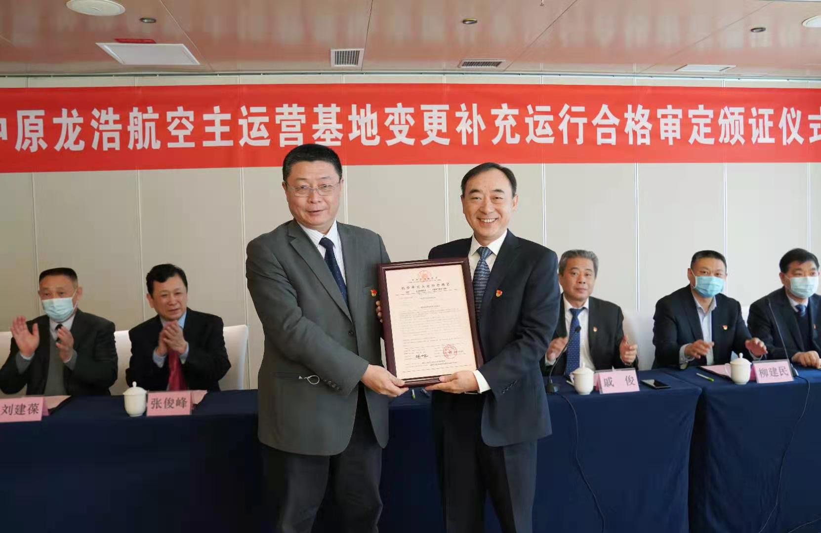 3月4日上午,民航中南地區(qū)管理局局長馬兵在鄭州向中原龍浩航空有限公司頒發(fā)了《航空承運(yùn)人運(yùn)行合格證》,這標(biāo)志著中原龍浩的主運(yùn)營基地由廣州變更至鄭州新鄭國際機(jī)場,進(jìn)入了鄭州廣州“雙基地”協(xié)同聯(lián)動、充分運(yùn)營的新階段。河南省財政廳黨組成員、副廳長趙慶業(yè)與馬兵共同參加頒證儀式并致辭,民航河南監(jiān)督管理局局長戚俊主持儀式。頒證結(jié)束后,馬兵等參觀了中原龍浩AOC運(yùn)行控制大廳。