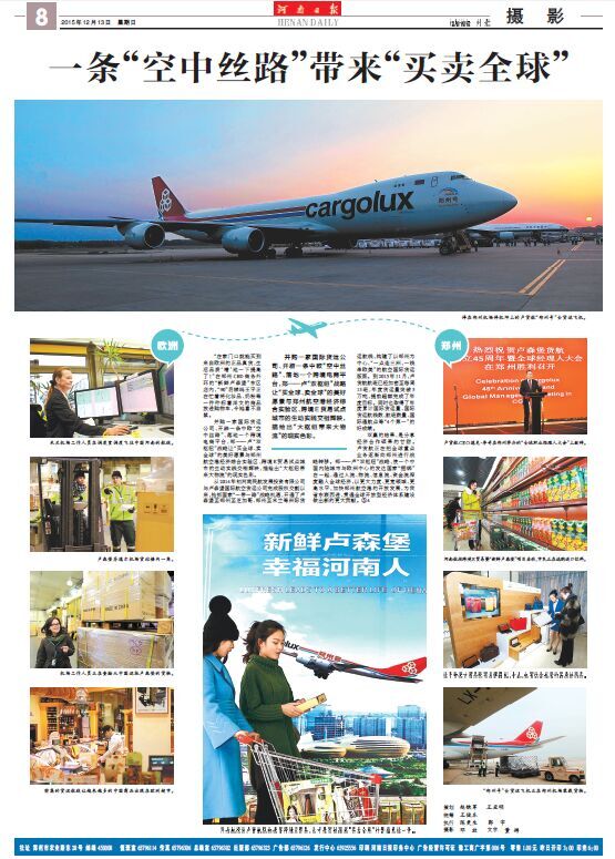 在8次報(bào)道中,既有會前的“熱身”宣傳,又有會中的集中點(diǎn)擊,還有會后的回顧追蹤,形成系列,精彩紛呈。13日,《河南日報(bào)》以圖文并茂的整版篇幅,對河南航投與盧貨航的合作,尤其是“新鮮盧森堡”雙向跨境E貿(mào)易進(jìn)行了詳細(xì)報(bào)道。整個報(bào)道以新聞攝影為主,既有盧貨航“鄭州號”波音747-8F全貨機(jī),也有鄭-盧航線的專業(yè)操作流程展示,還有河南百姓采購“新鮮盧森堡”商品的真實(shí)場景……以鄭盧“雙樞紐”為典型案例,圍繞“一條‘空中絲路’帶來‘買賣全球’”這一主題,生動展現(xiàn)了河南省依靠藍(lán)天對外開放的新思路和新成就。