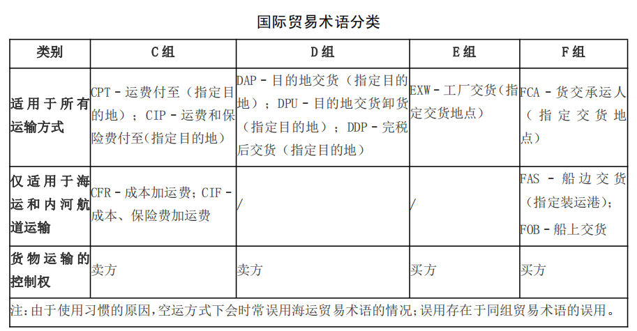 在國際貿(mào)易的貨物銷售合同中,進(jìn)出口商使用國際商會(huì)《國際貿(mào)易術(shù)語解釋通則》(Incoterms),界定買賣雙方在風(fēng)險(xiǎn)、成本、運(yùn)輸和保險(xiǎn)方面的義務(wù),避免誤解、爭(zhēng)議與因此導(dǎo)致的損失以及其他法律難題。根據(jù)最新的《國際貿(mào)易術(shù)語解釋通則》2020版,國際貿(mào)易術(shù)語共分成2類4組11個(gè)。
